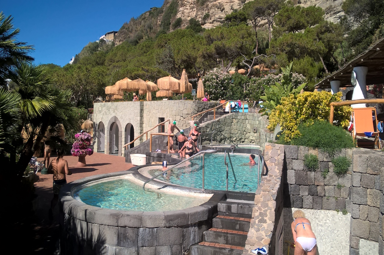 Искья известна своими отелями с термальными источниками. Это уникальное сочетание размещения и лечебной инфраструктуры делает отдых на острове особенным. Многие гостиницы располагают собственными бассейнами с термальной водой, которая подается напрямую из природных источников, насыщенных минералами и серой.